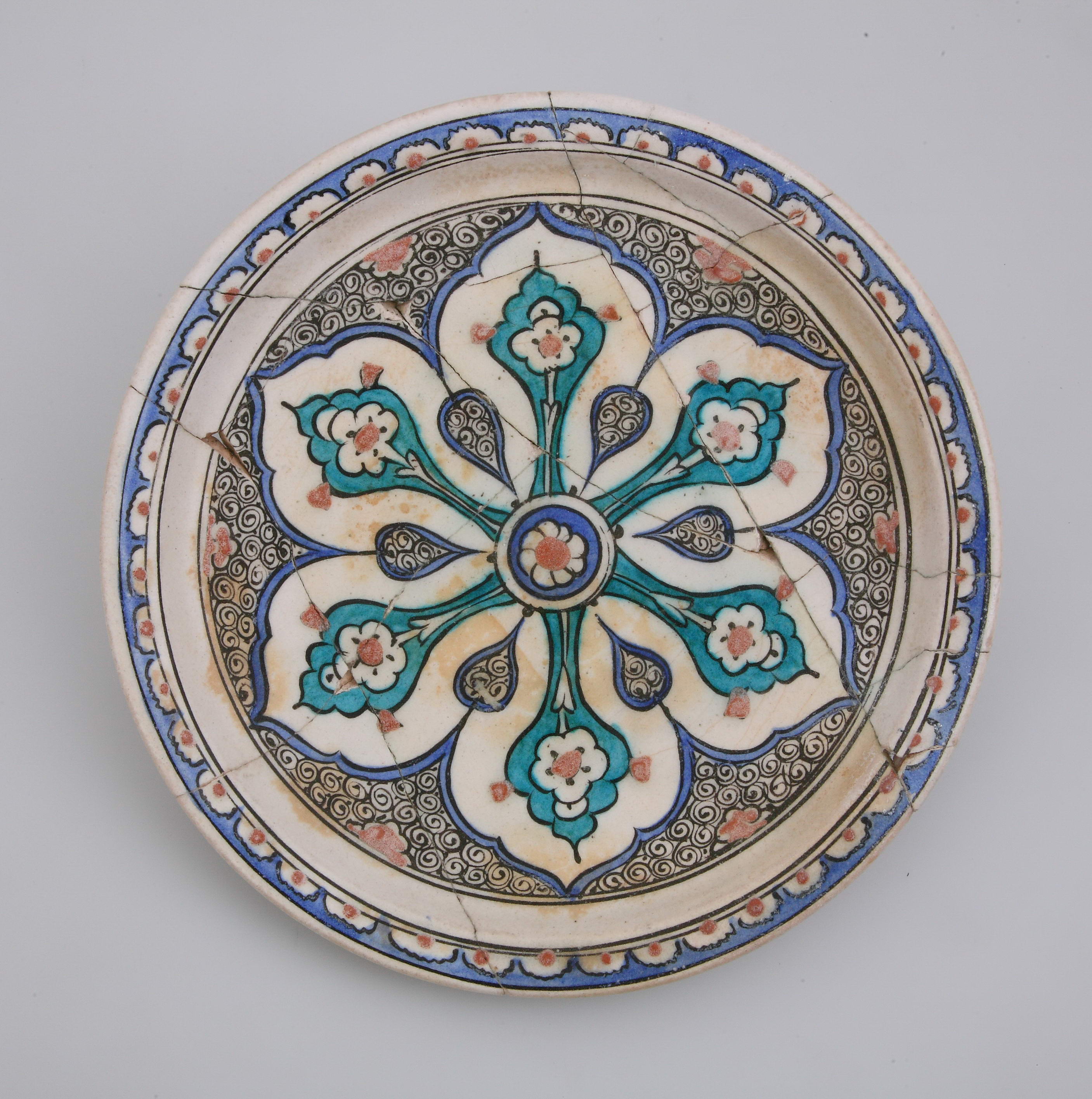 2012 nyarán Esztergom Vízivárosban folyó régészeti ásatásunkon elkerült,török kori edény-kincslelet egyik legpompásabb darabja. A tál rendkívül jó minőségű, Iznikben (Törökország) készült a 16. század második felében. Különleges, díszedénynek számított, magas rangú esztergomi török lakos tulajdona lehetett. 6 másik izniki tányérral együtt rejtették el a földbe, egy faládába elcsomagolva, ami 2012-ig pihent rejtekhelyén.